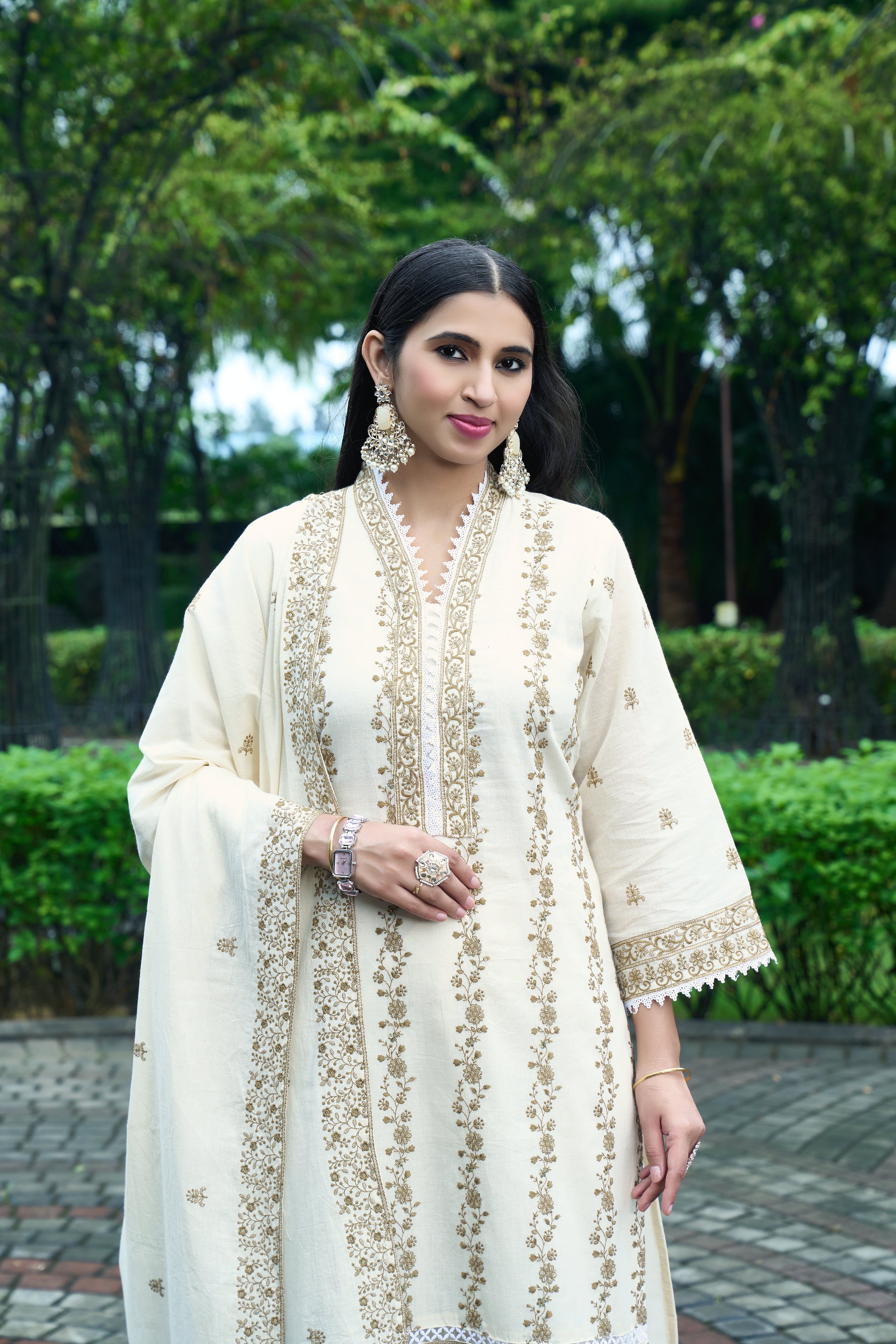 Step into timeless elegance with this cream embroidered Kurti set, a perfect blend of tradition and sophistication. Crafted from soft, breathable fabric, the outfit features intricate golden thread embroidery that adds a touch of royal charm. The straight-cut Kurti paired with embroidered pants and a matching dupatta creates a graceful silhouette that flatters every body type.
