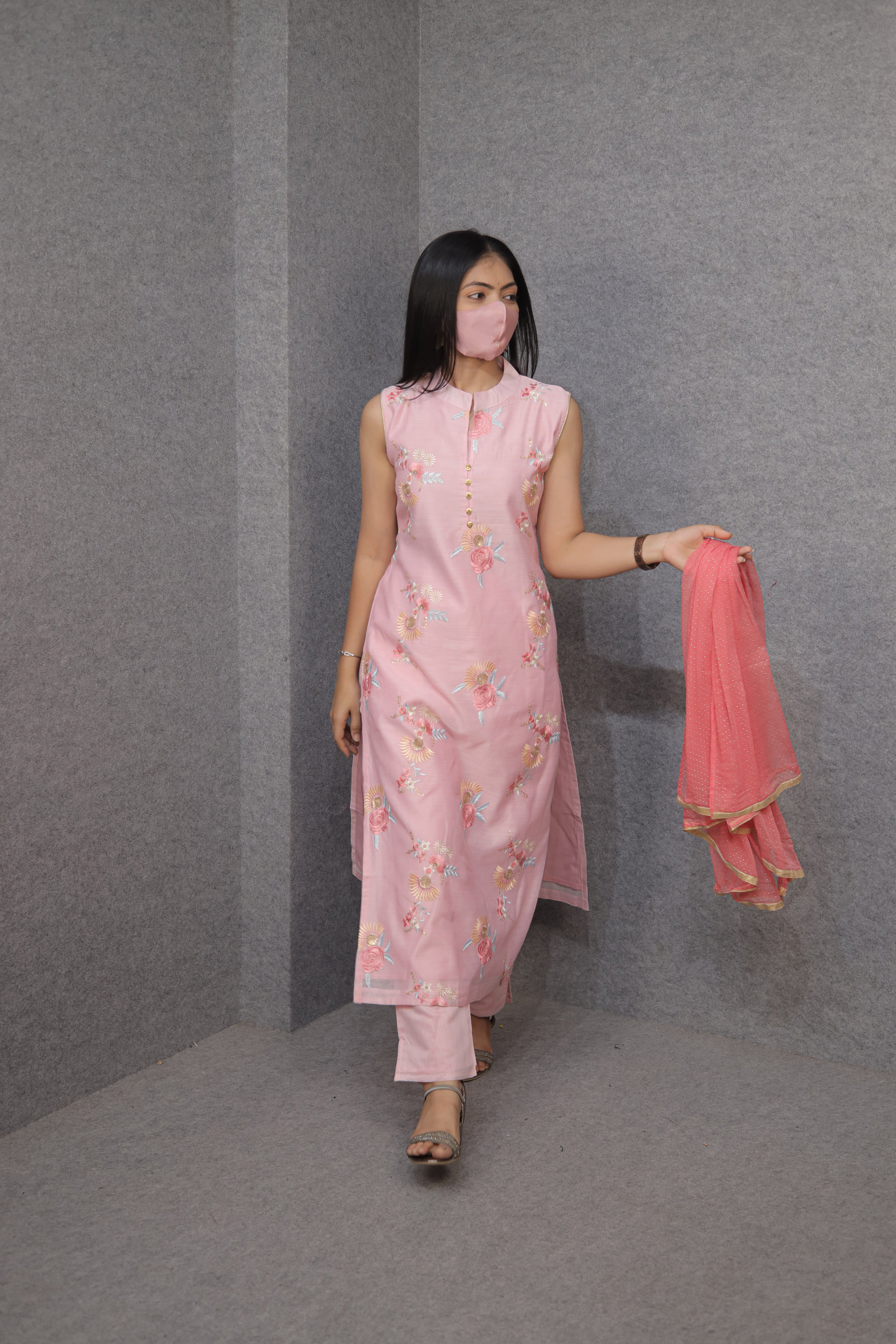 Pink Sleeveless Kurti Pant Dupatta Set for Women | Embroidered|